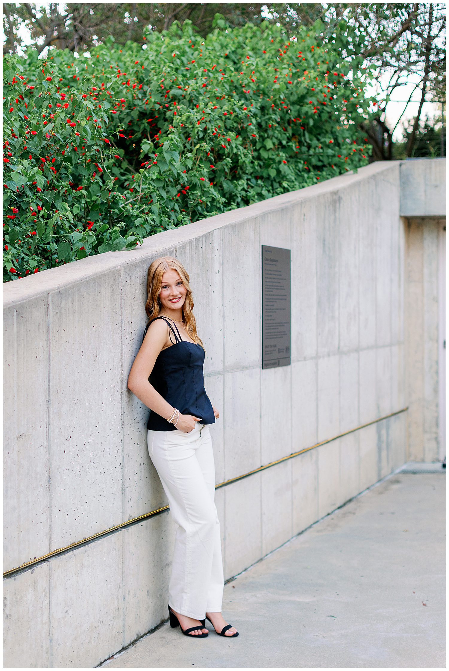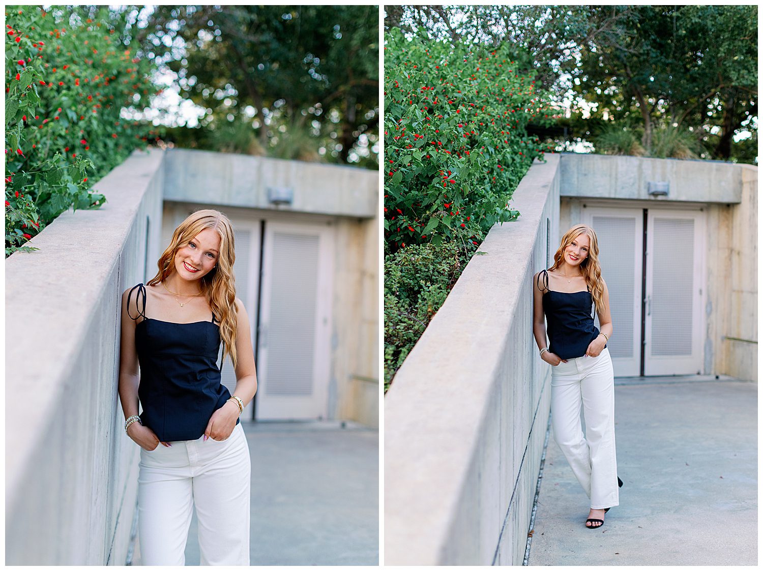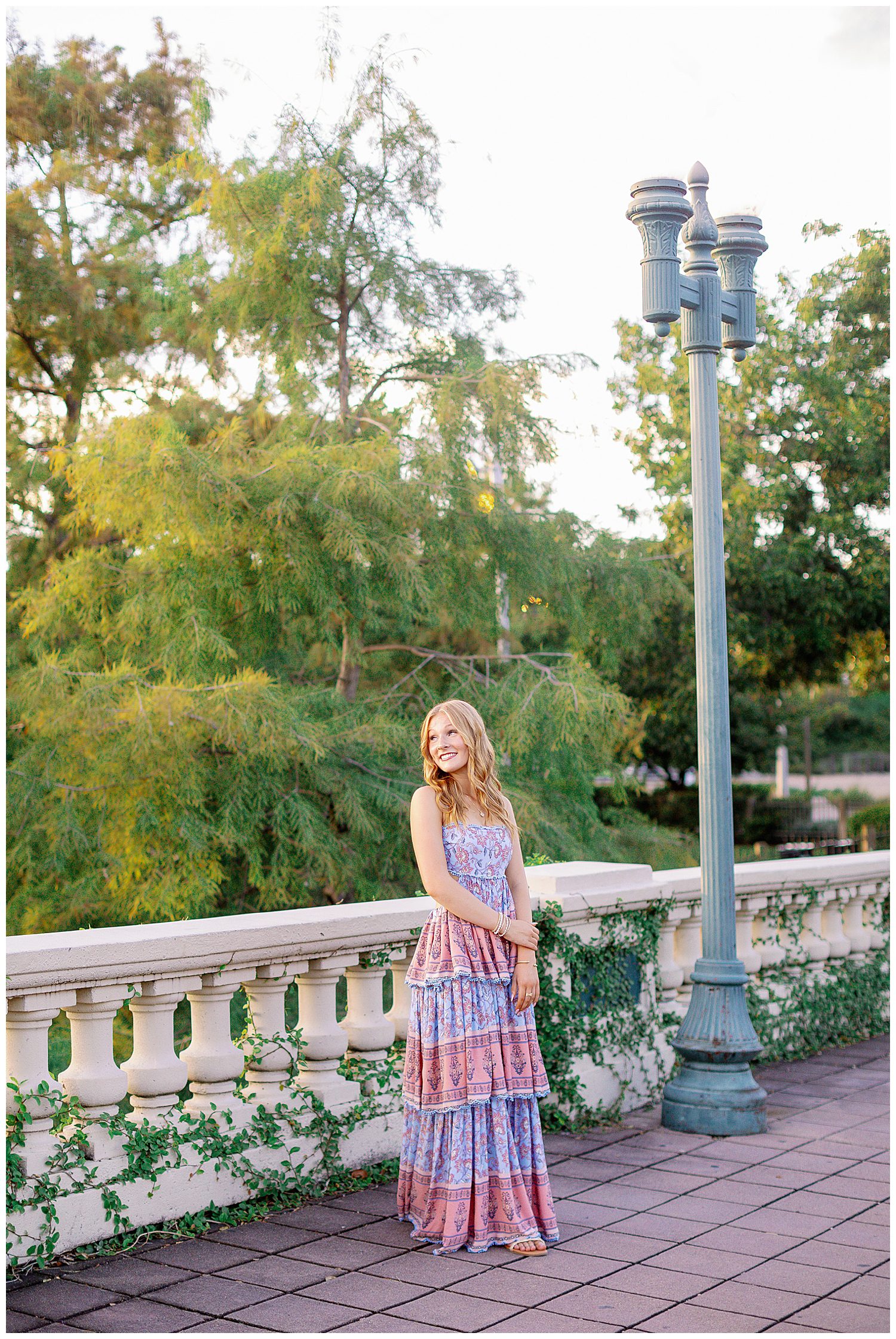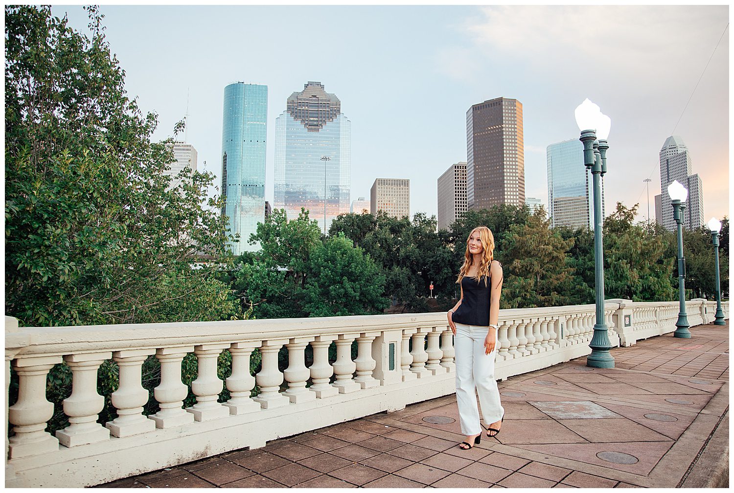 For her Buffalo Bayou senior pictures, Ellie brought three stunning outfits that fit the setting perfectly. She started in a white dress from Hello Molly paired with brown cowboy boots, a timeless Southern look that popped beautifully against the North South treeline located in the Houston Museum District. Ellie also brought along her senior graduation cap and gown, celebrating how far she’s come and what’s next to come. Her second look was pure magic: a flowing pink and blue floral sundress from Hazel and Olive that caught the breeze as she walked through a field of flowers at Buffalo Bayou Park. She ended her session with a modern, polished look: white pants and a black top, perfect for those sleek skyline shots on the Sabine Street Bridge. Each look showcased a different side of Ellie’s personality — confident, joyful, and adventurous. With the perfect Houston skyline, the soft fall light, and Ellie’s radiant smile, her session was everything we love about capturing seniors in the city.
